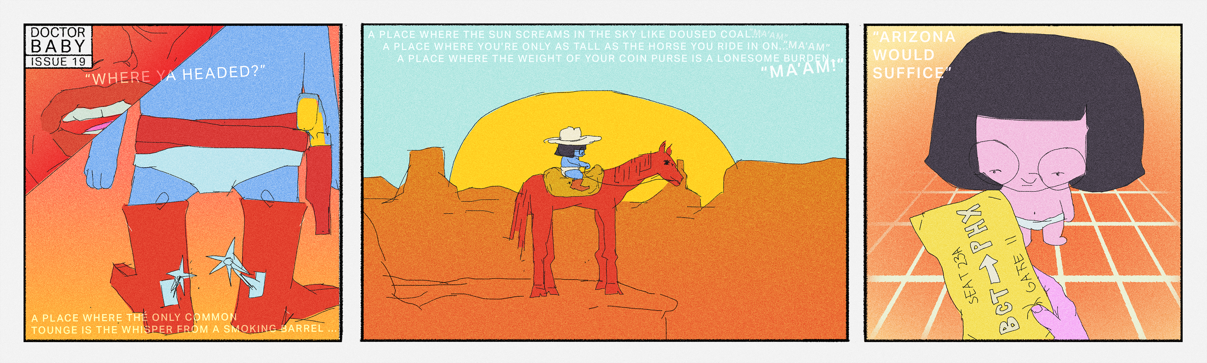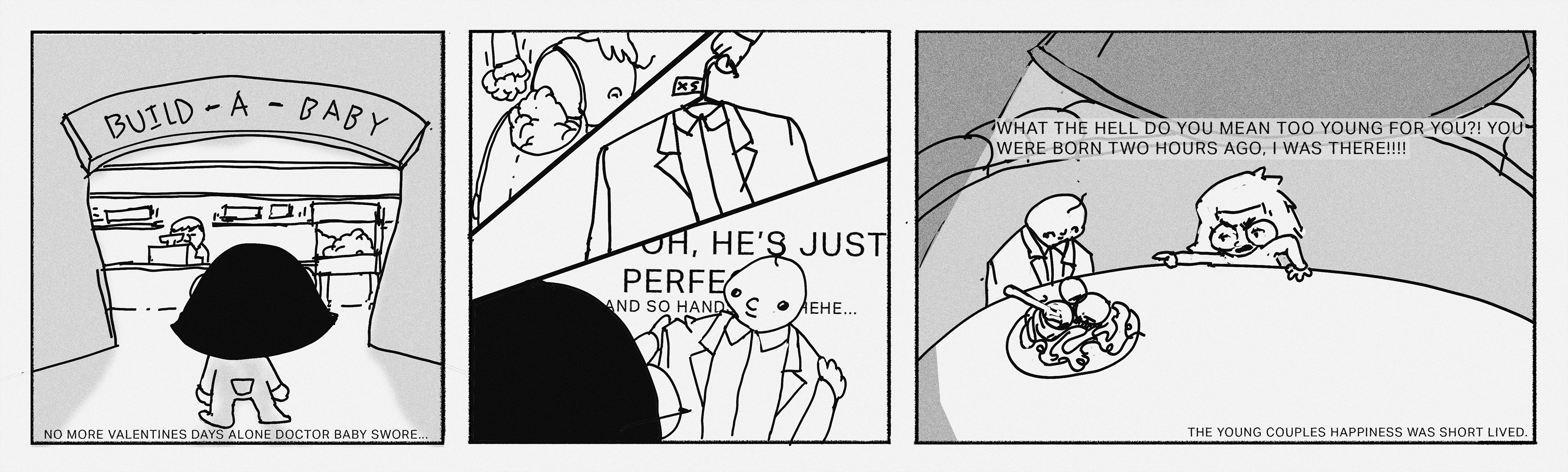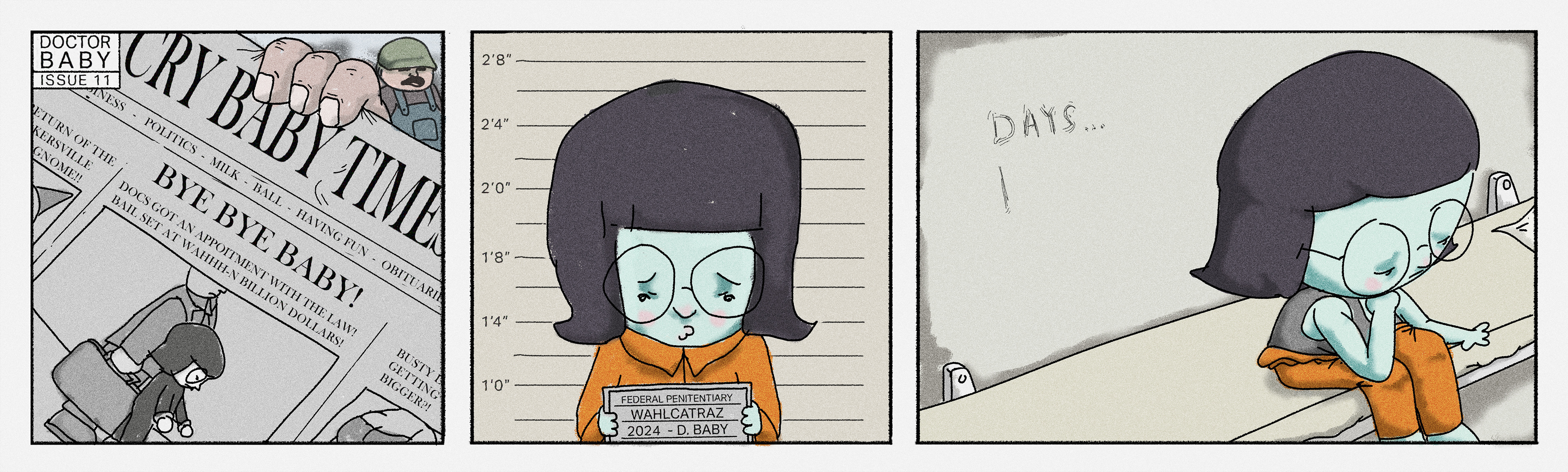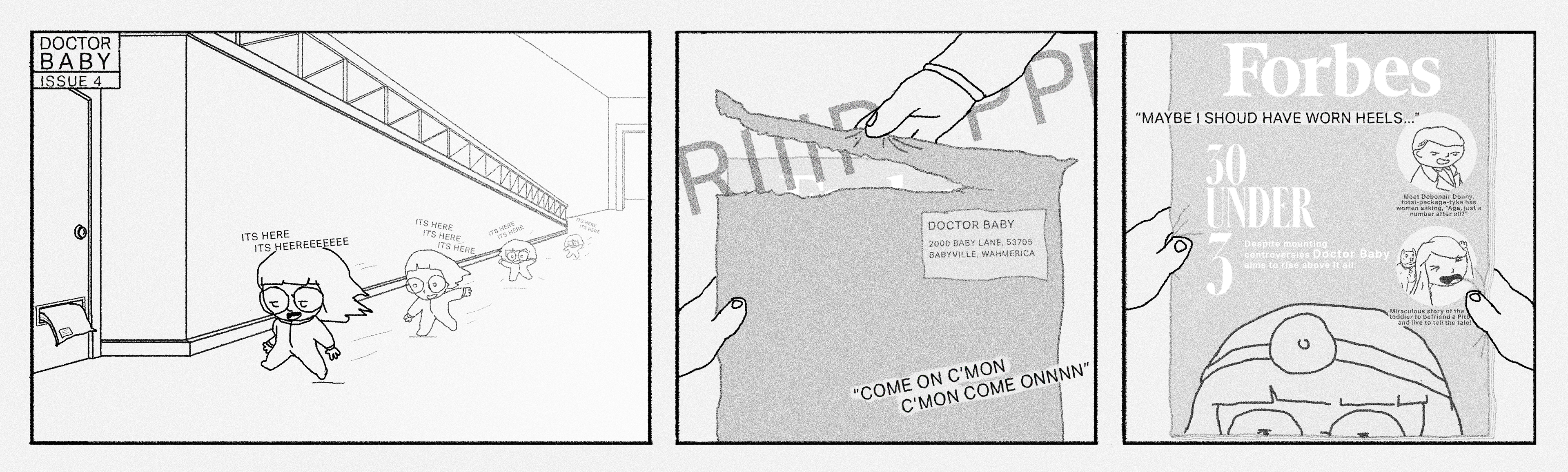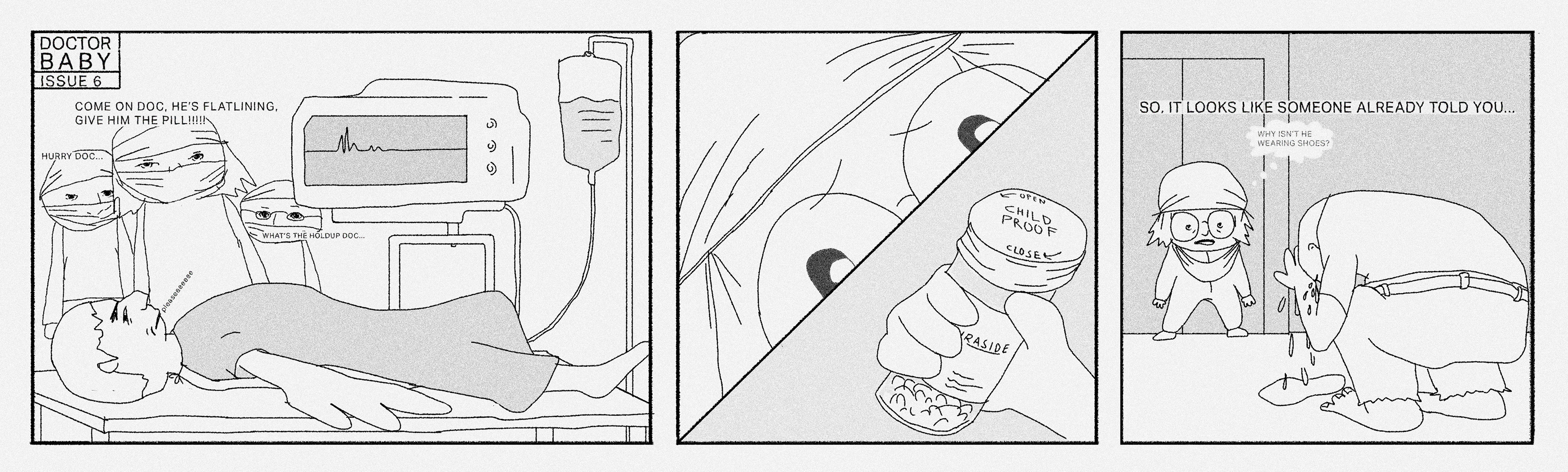 Doctor Baby is a comic strip I make for my girlfriend. It began as weekly tales of Doctor Baby getting into some sort of trouble or ruining someone's life; however, it eventually became an outlet for free form creativity and jokes.